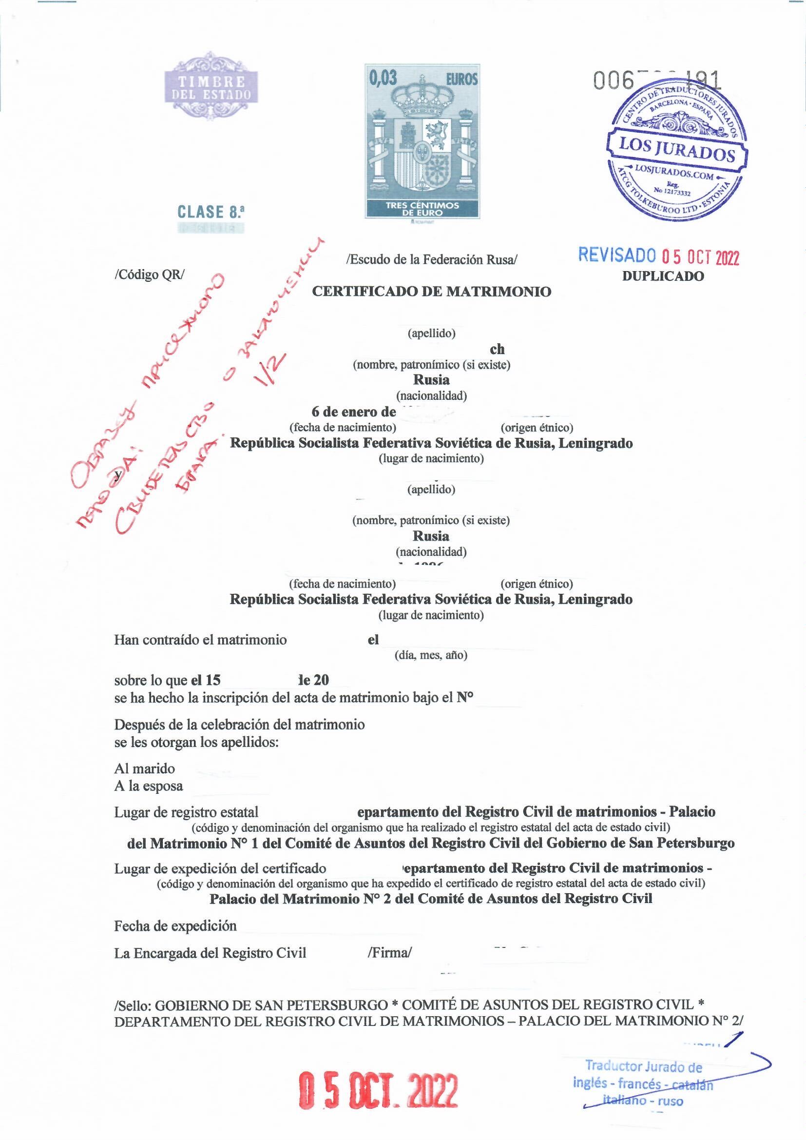 - Spanish sworn translations of their marriage certificate